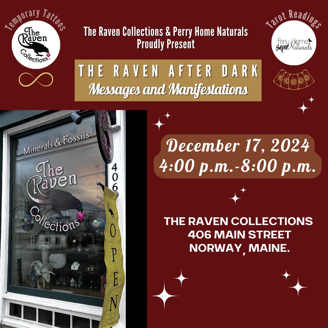 To reserve your spot, call 207‑744‑2018 (The Raven Collections) or send a message via Facebook Event Link.