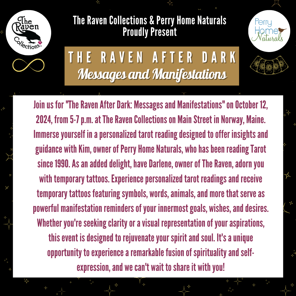 Join Kim from Perry Home Naturals for an afternoon of intuitive tarot readings at The Raven Collections.