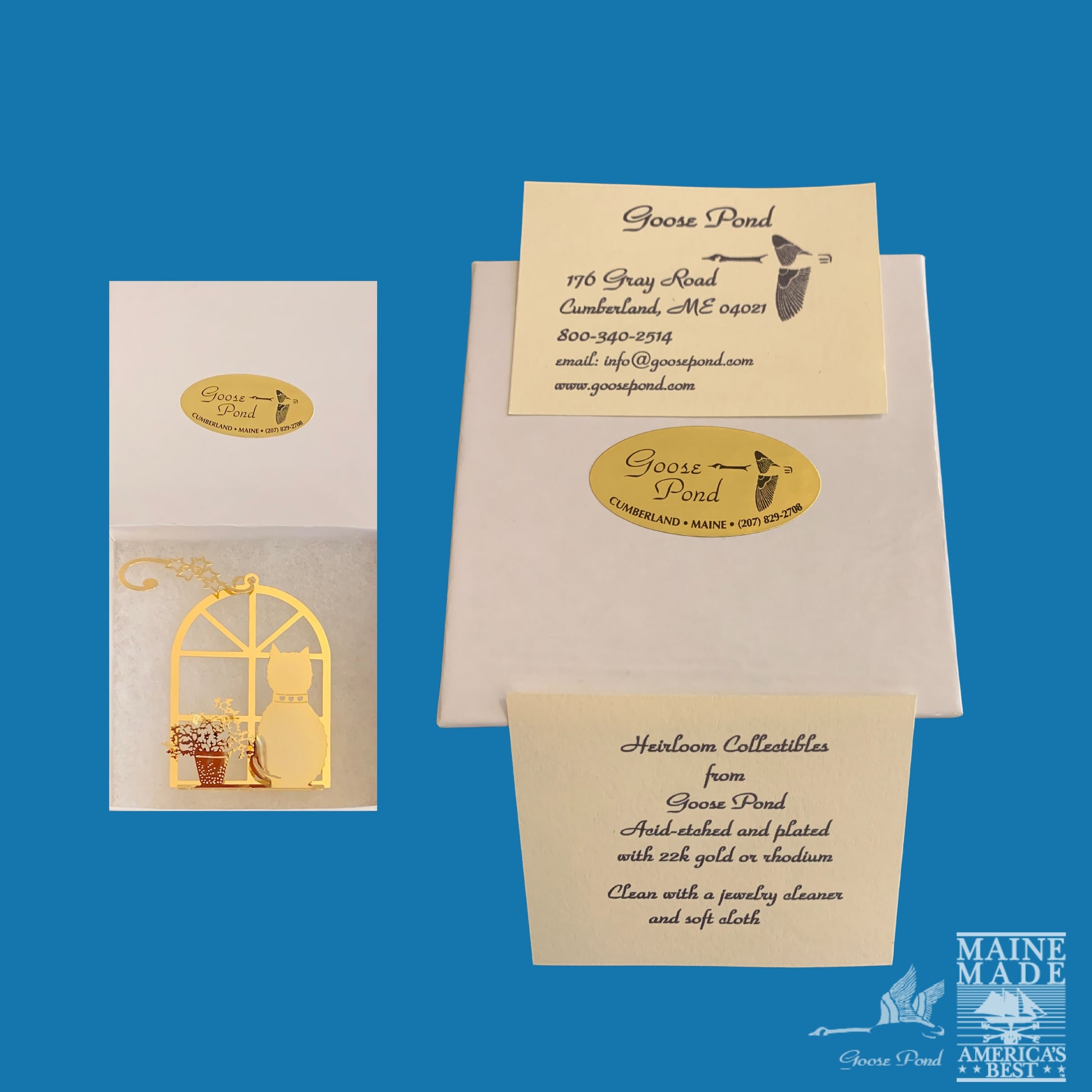 Goose Pond Ornaments are handcrafted by Susan Pine in Cumberland, Maine. They make for a beautiful gift that will be cherished for generations. Each ornament is made using an acid-etching technique, starting with original artwork. These ornaments are plated with a 22k gold finish. Additionally, each ornament comes with a unique decorative hook and gift box. Each ornament is approximately 3".