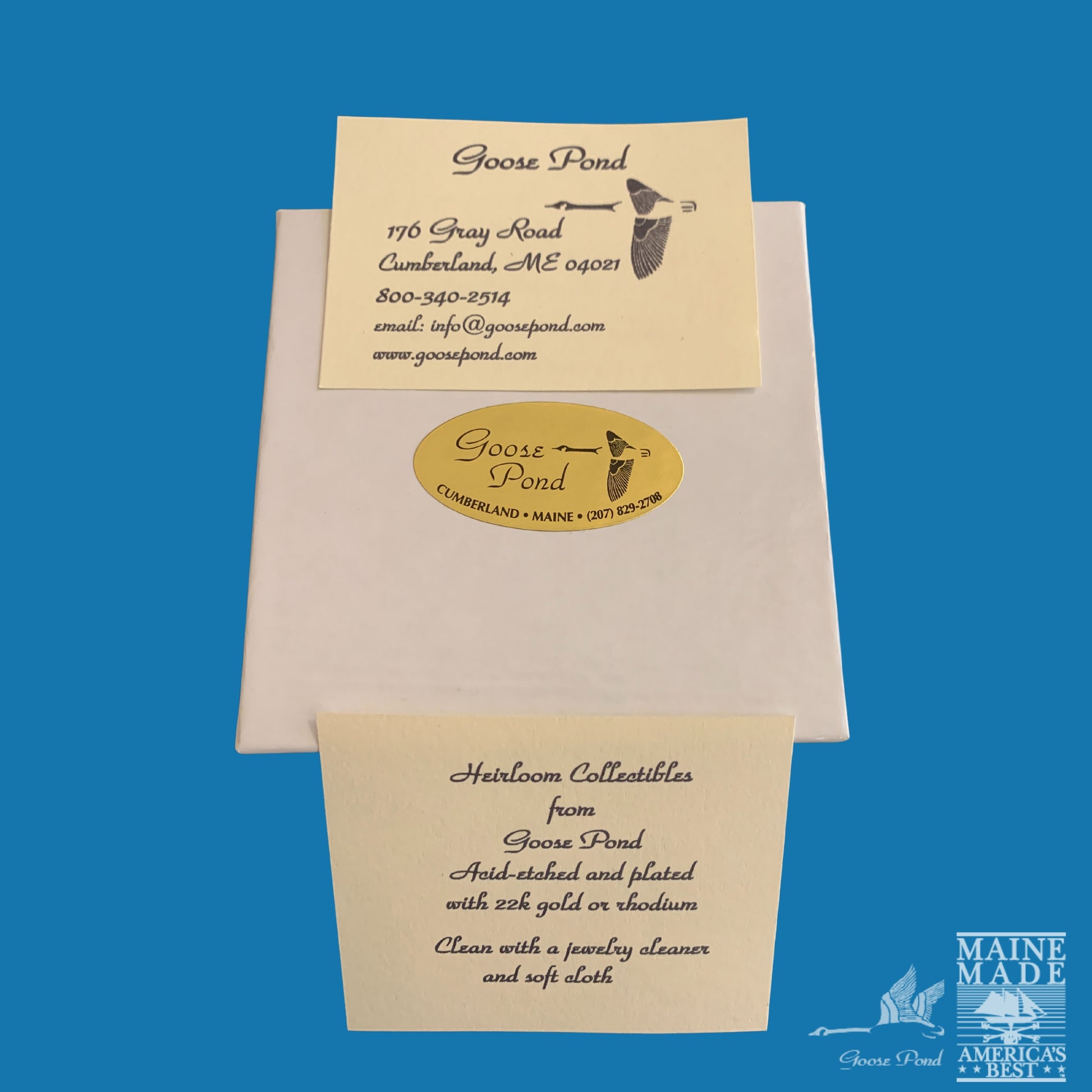 Goose Pond Ornaments are handcrafted by Susan Pine in Cumberland, Maine. They make for a beautiful gift that will be cherished for generations. Each ornament is made using an acid-etching technique, starting with original artwork. The silver ornaments are finished with a tarnish-free rhodium silver finish. Additionally, each ornament comes with a unique decorative hook and gift box.Â